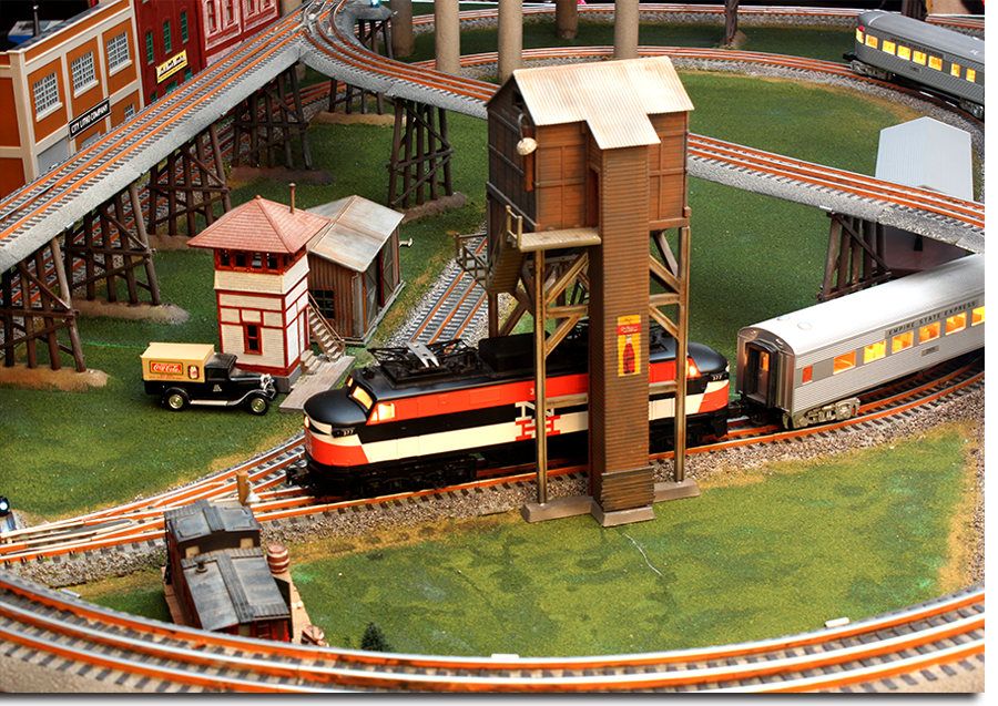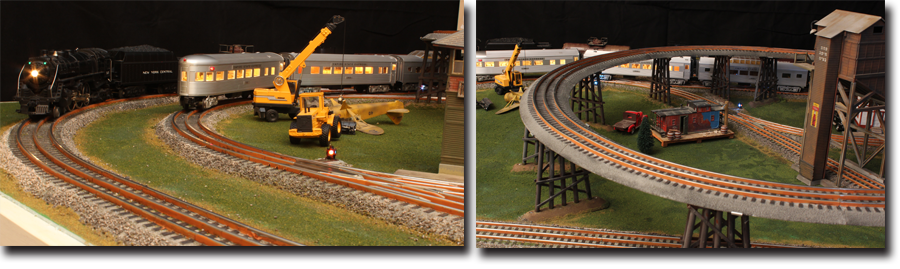 O gauge, 5' x 10' table layout running 2 trains at the same time. All tracks connected for elaborate operation. 2 reverse loops and a siding. Outside loop is 48" for large locomotives. Old fashion Block control.