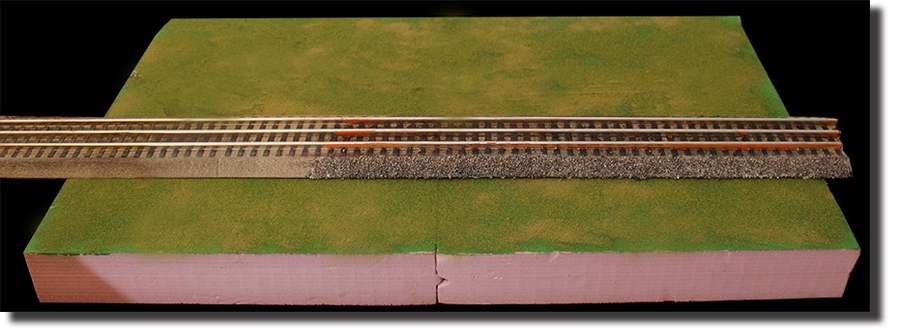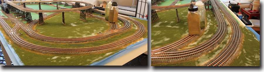 Lionel FasTrack is very toy looking out of the box. With some work and techniques we have developed we are able to give it a great look. The rail sides are painted with rust color paint, then we coat the roadbed angles with glue and sprinkle ballast to cover. The glue with the ballast will also attach the track to the foam base. Once it is all dry we go over the road bed with a black paint wash. The area on the right shows the first test we have done. We are testing different paints and glues to make the weathering durable.