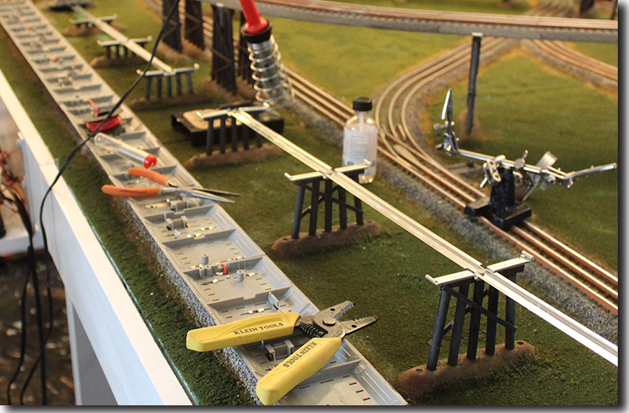 The ramp to the elevated track section has been showing some issues with electrical connection so we applied solvent to secure the tracks together and soldered jumpers at all the connections to ensure electrical connections.