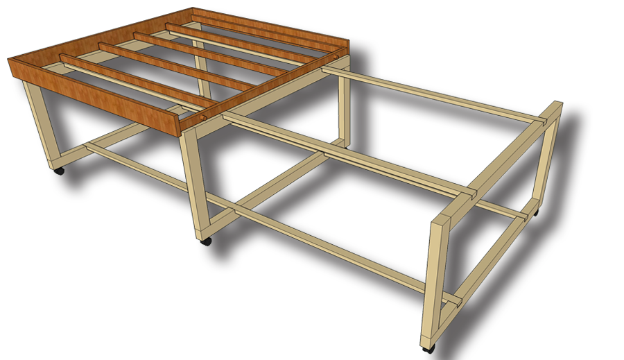 The legs are made from three 29" x 5' sections that are 3" side and 2" deep. The end sections fit inside the top unit and the the center section holds both top units in place. The three sections are connected by four 10' beams. The entire leg assembly is carried by six double wheel casters.