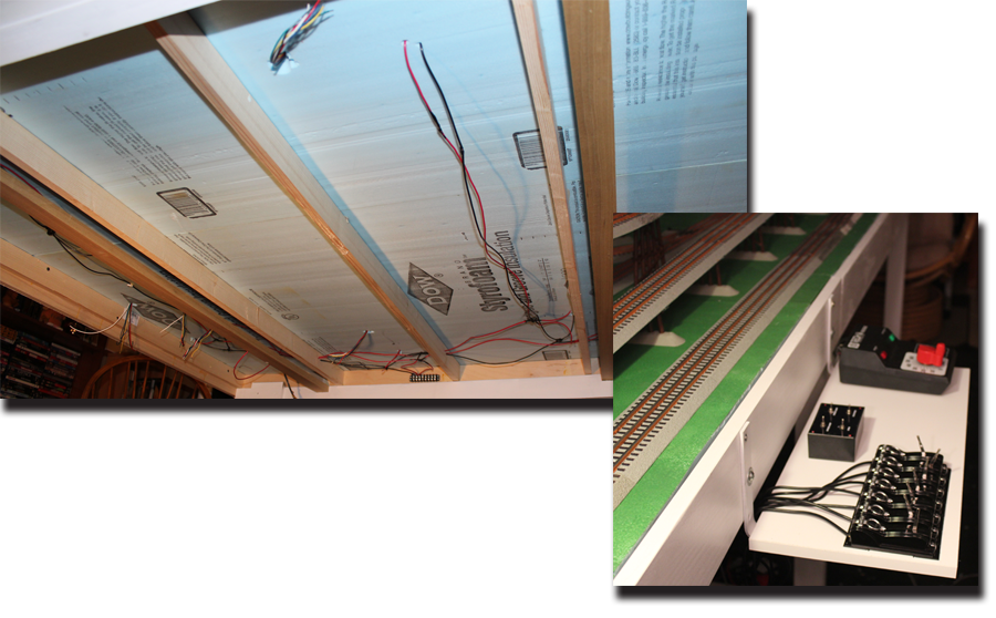 14 gauge power feeders are soldered to the track in several points along each block and connected below the table. The control panel shelve is in place and the wiring to the switch controls, block control and transformer begins.