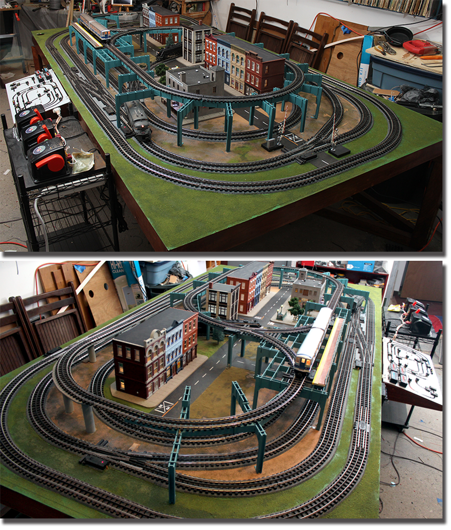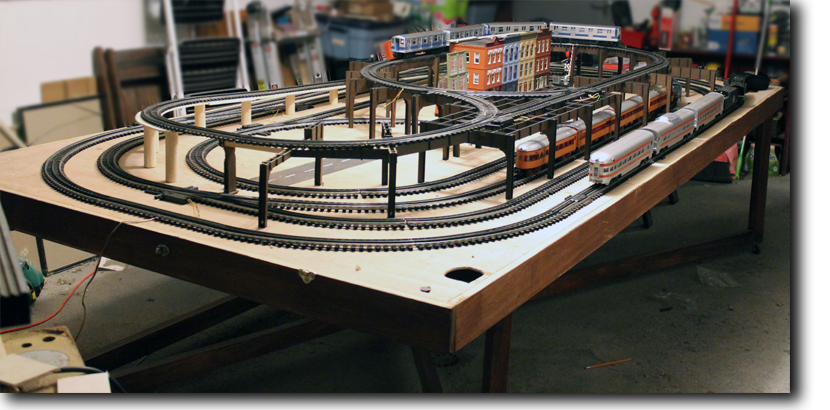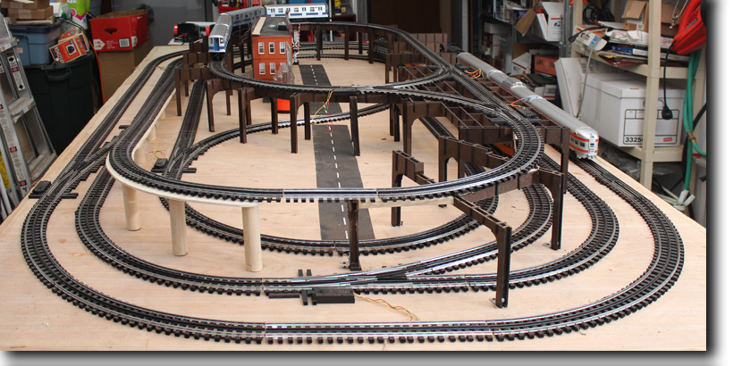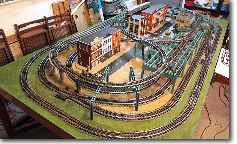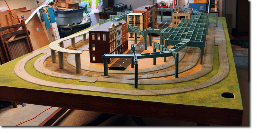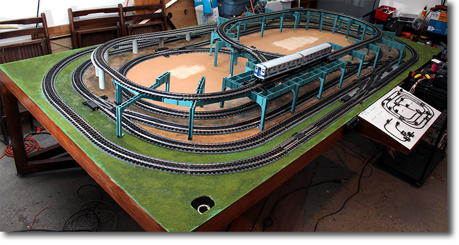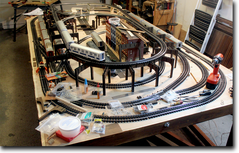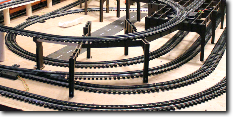 All the track is in place and secured. Elevated track system and the ramp are secured to the table. The switches are wired including none-derailment wiring. Several trains have been tested for clearances. Next steps are the buildings, sidewalks and streets.