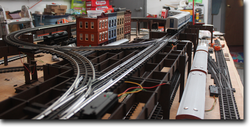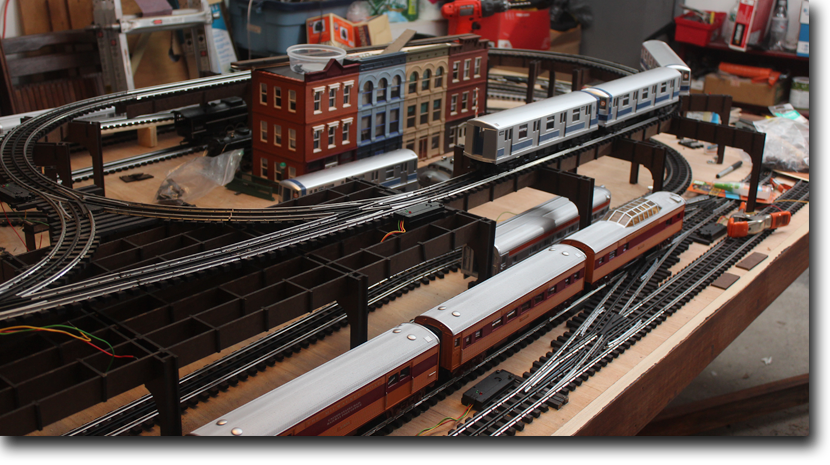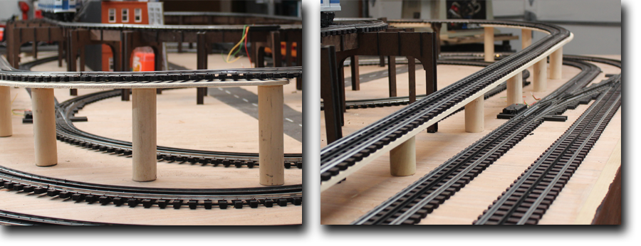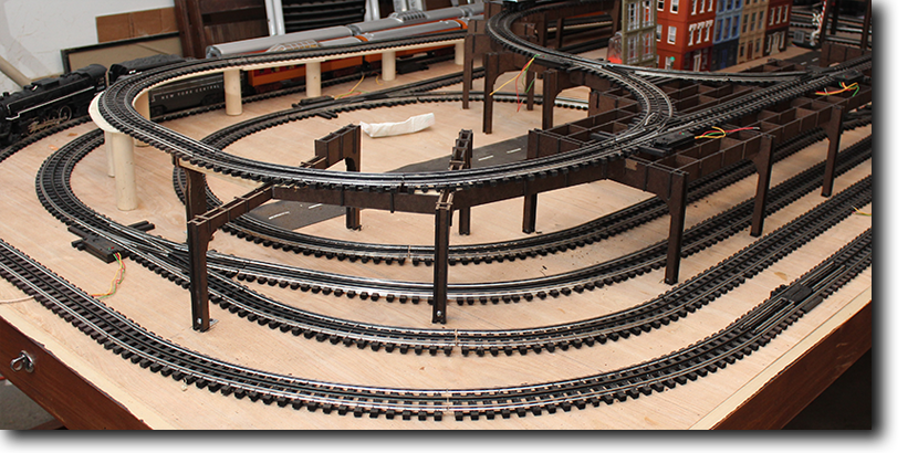 All the track has been cut and placed, we are working now on completing the elevated track system and securing it to the table. As we work we always run trains to check for any shifting of the track that might cause problems with clearances.