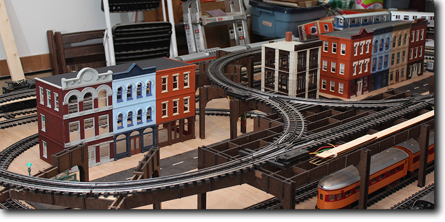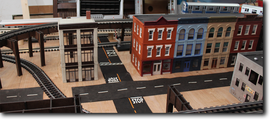 Constantly testing the clearances and readjusting the track plan as needed. The building is in place a road has been added, these elements help us visualize what the layout will look like. We strive to create layouts that are visually interesting when viewed as a whole from a distance. The WOW factor is important when building layouts for other people.