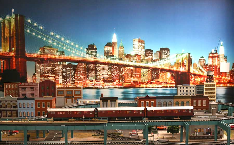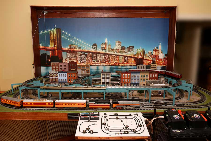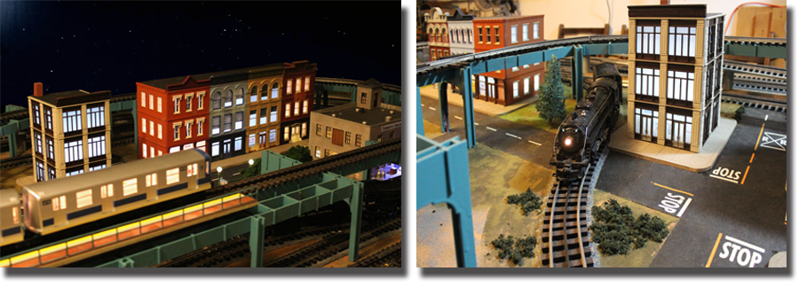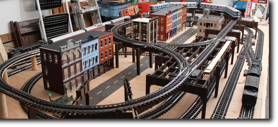 O guage, 5' x 10' table layout running up to 3 trains at the same time. All tracks connected for elaborate operation. Old fashion Block control. New York City theme with elevated track and buildings. Complete layout lifts into a wall unit for storage.