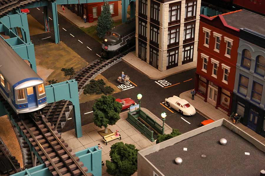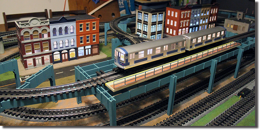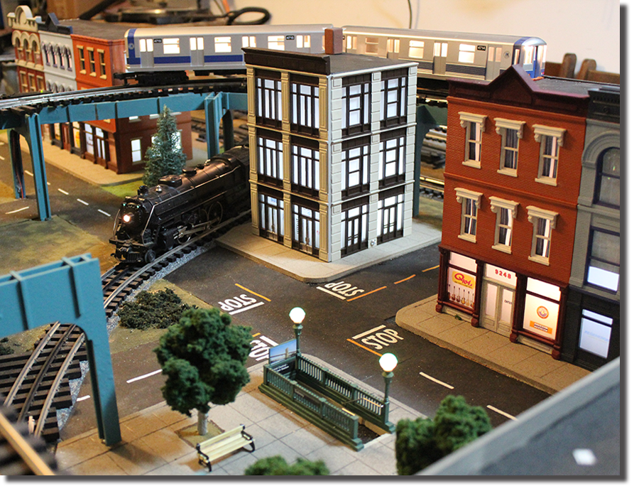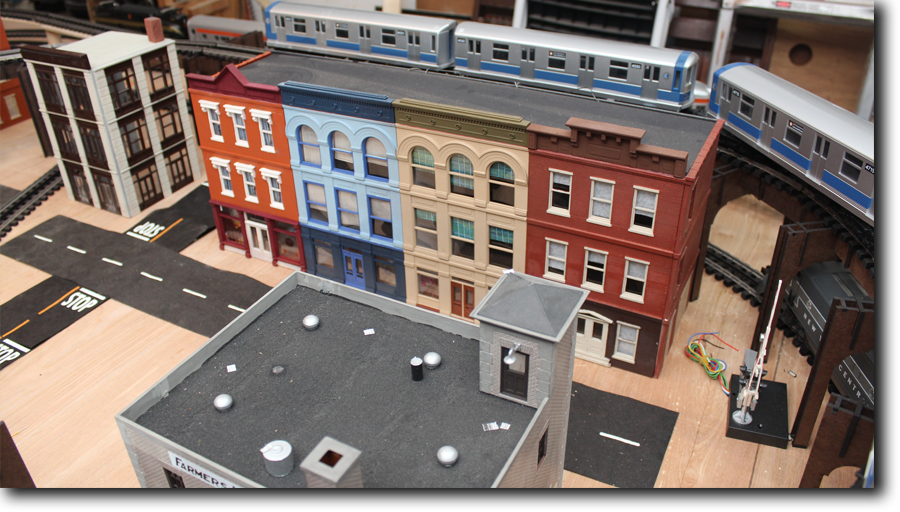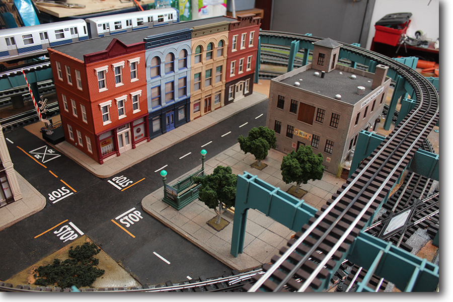 All have been secured to the table with bolts, that allows for easy removal for repairs. Next, the buildings have been electrified with Woodland Scenics lights. The dimmer controls are affixed to the control panel and each dimmer set (4 lights) has an individual on/off switch. The subway platform has been built and painted, due to the delicate railing the whole platform will be secured with bolts for easy removal in transport.