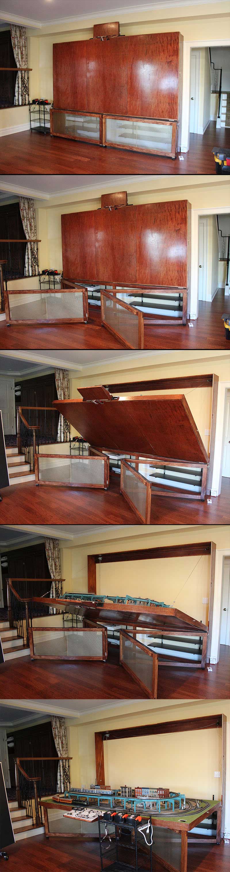 We needed to designed a whole new concept in train tables. What we came up with is a table that is lifted with an electric hoist onto a wall unit. The wall unit has depth of 12" that allows for 6.5" high elevated track and buildings that are about 10" high. The table legs are hinged to each other and the back of the table, they are on wheels and fold back when not in use. The whole unit extends 25.5" from the wall. To open the user extends the legs, lowers the table, releases the latches that secure it to the wall unit and then the table can be moved around.