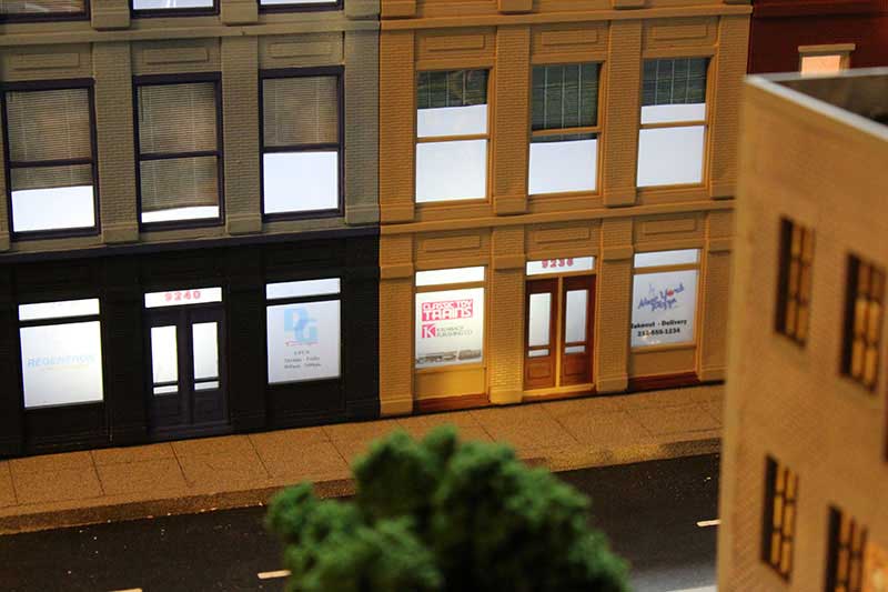 Fronts are masked and spray painted. Once they are dry I do the detailing and assembly. The window dressing is made from images of blinds and curtains I found on the Internet and some from the original kits. The bottom windows are made from printable transparencies and printed with logos and other graphics. The interior is divided and will have lighting by Woodland Scenics.