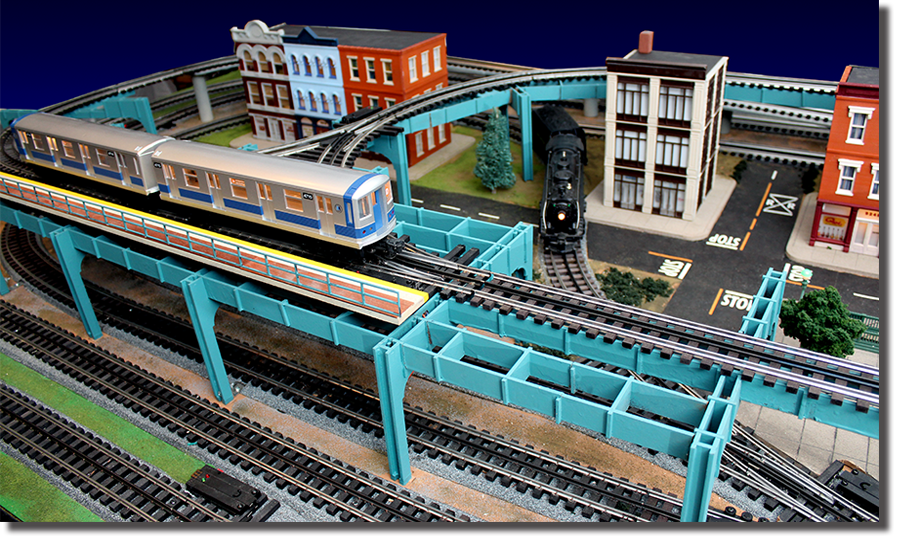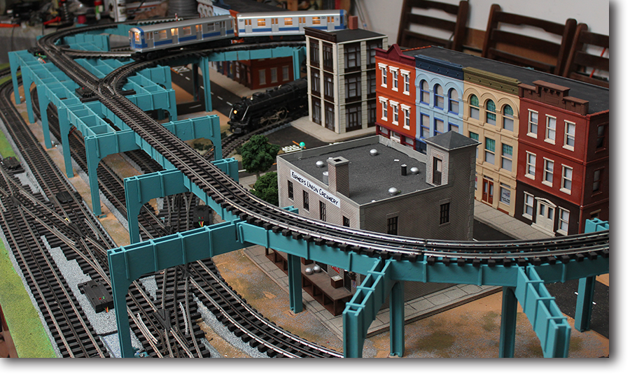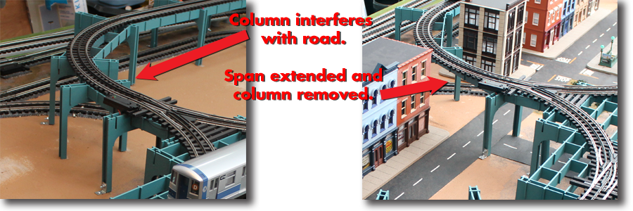 Once we started placing the scenery elements we realized that two columns, supporting the elevated track, were in the way of elements on the bottom. One column restricted the clearance for long rolling stock and the other was in the way of the main street. We could of kept them and moved or curved the street but the visual result was not what we wanted. So the columns were removed and the spans above expanded with additional internal support. The image below shows where the street column was and the result of its removal: