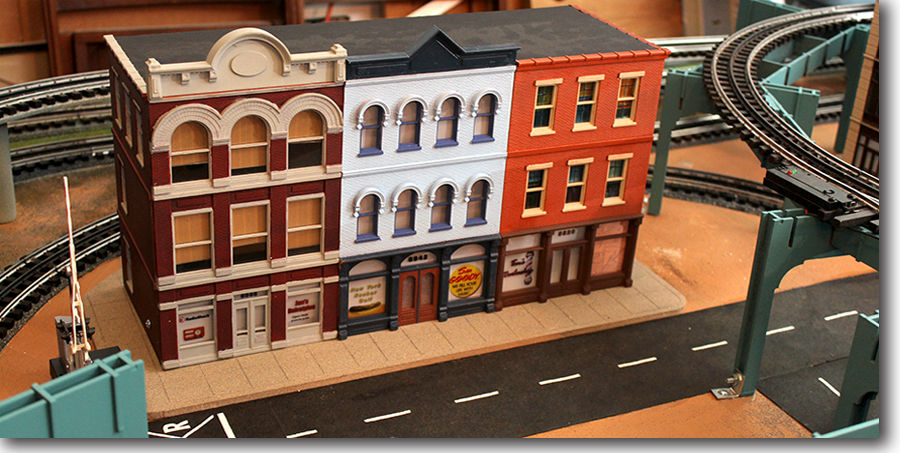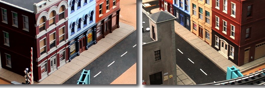 Three more buildings are now in construction. Two will be on the same side of the road as the first one, one is a single unit bank style building and the other is a three unit similar in style to the first unit. Now we have room for an intersection and the additional road lead to the track behind and another pace to put a crossing gate.