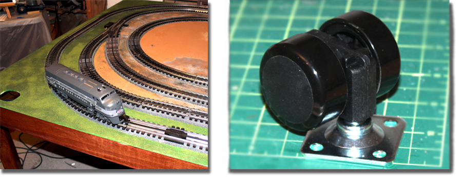 Below is a view of the table corner showing the ground cover texture and track secured on the road bed. The right image is one of the new casters we found to replace the ones we originally installed. These casters are the same height with two wheels instead of one. They look nicer and seem to be stronger, we will see how well they perform once we have the table in place.