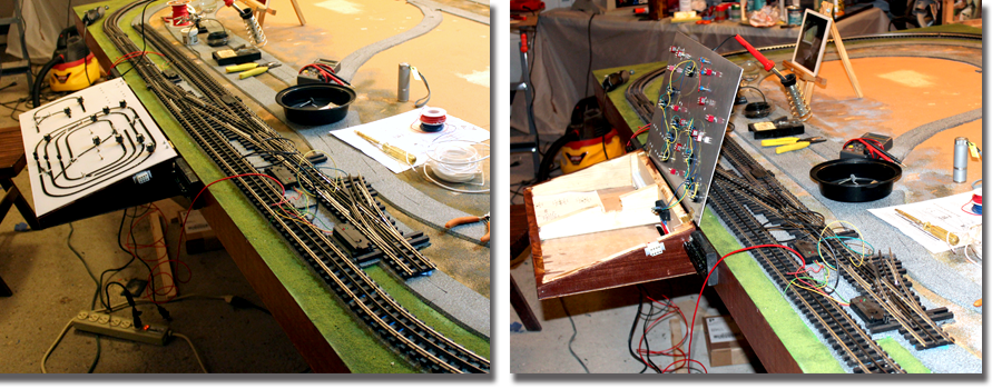 All the track for the lower level is now in place and it is wired to the block selectors on the control panel. All the switches have been wired and to ensure maximum reliability we decided to use the original Z-Stuff controllers to fire the switches. All switches have the none derailment feature activated and tested. For now the switches are powered from the constant voltage of two of the transformers. If we find that the voltage is not sufficient we will add a dedicated transformer just for the switch power.