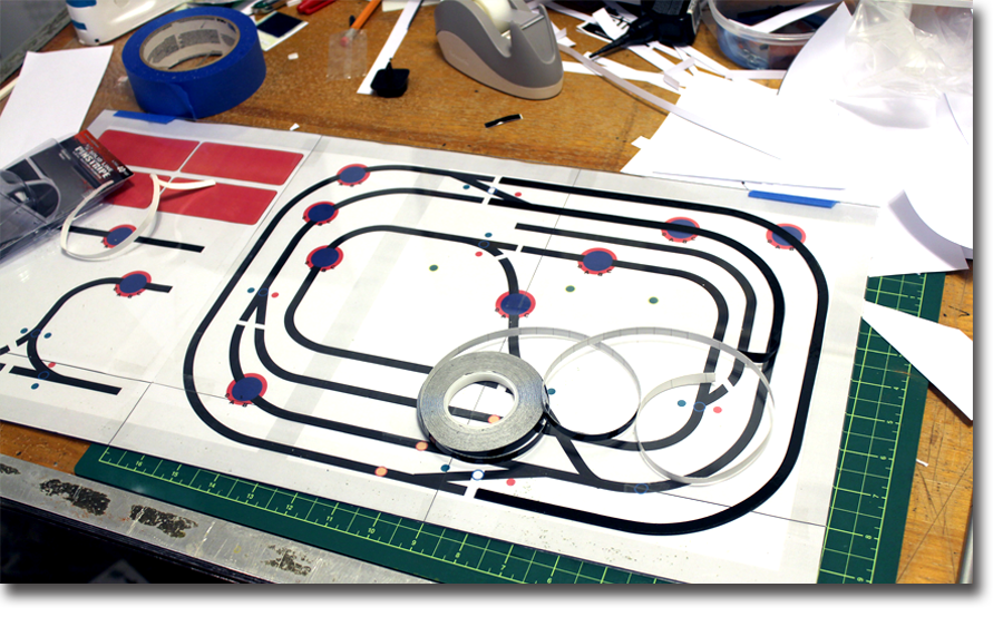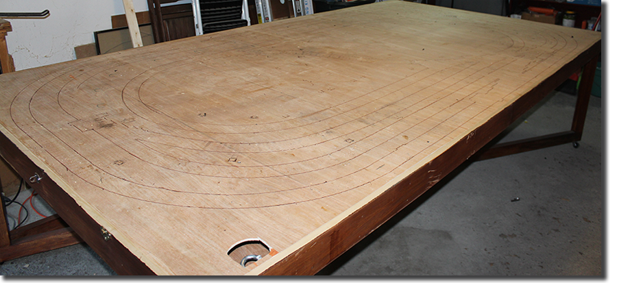 Before we can start working on the road bed and the ground cover we have to remove all the track and structures so we marked all the track placements and the locations for the elevated track system. This is what the table looks like with the markings: