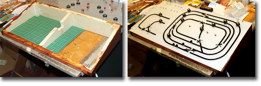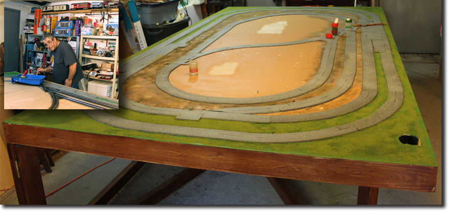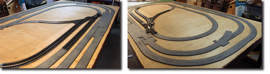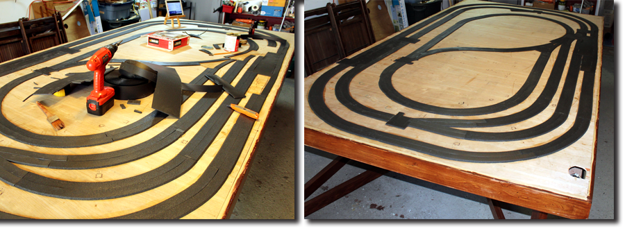 Table has been reassembled and ready for the roadbed. The track centers have been marked to apply the roadbed in halfs. We used Woodland Scenics foam roadbed and attached it with contact cement.