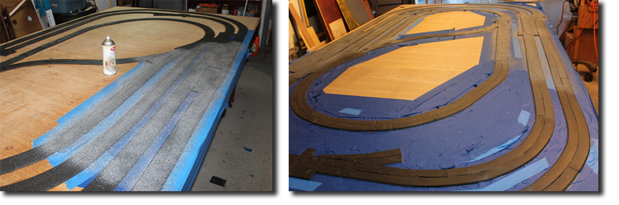 Painter's tape is used to mask the roadbed and painted using Krylon Stone Textured Finish spray paint. This will simulate ballast.