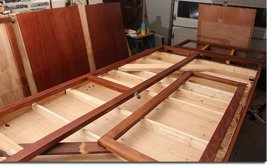 This project requires an elaborate table system. The table size is 5' 2" x 10' and 30" high. Built to address the customer's mobility limitations the table needs to be accessible from all directions because the customer can reach about 2.5 feet onto the table. In addition the table needs to be out of the way when not in use.